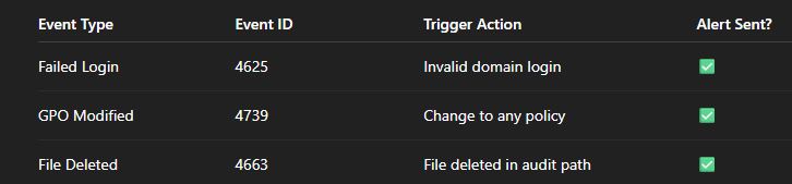 The purpose of this project is to implement advanced event monitoring and automated email alerts for key security events like failed logins, GPO changes, and sensitive file deletions in a production-like domain environment.
