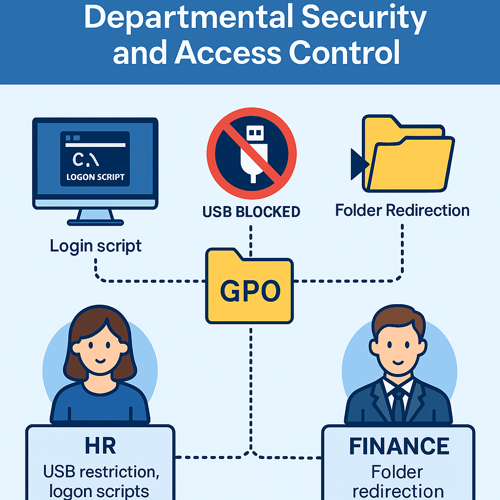 This project demonstrates how to design department-level IT policies using GPO, enabling real-world security enforcement such as:
