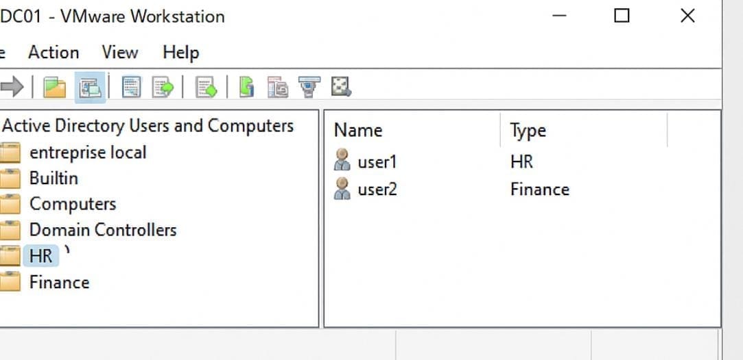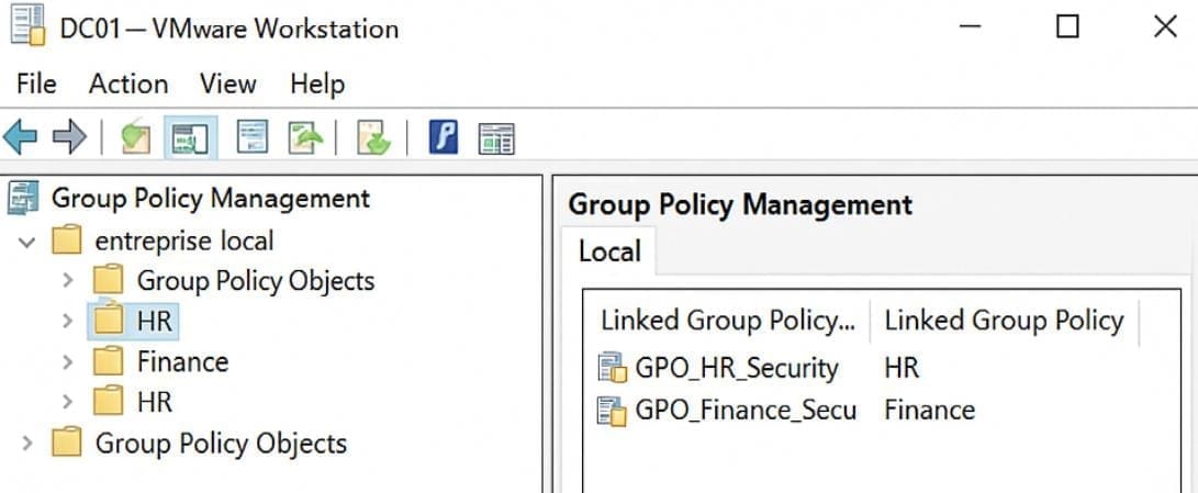 The purpose of this project was to implement fine-grained Group Policy Objects (GPOs) based on departments (e.g., HR, Finance), using Active Directory Organizational Units (OUs) and security filtering.